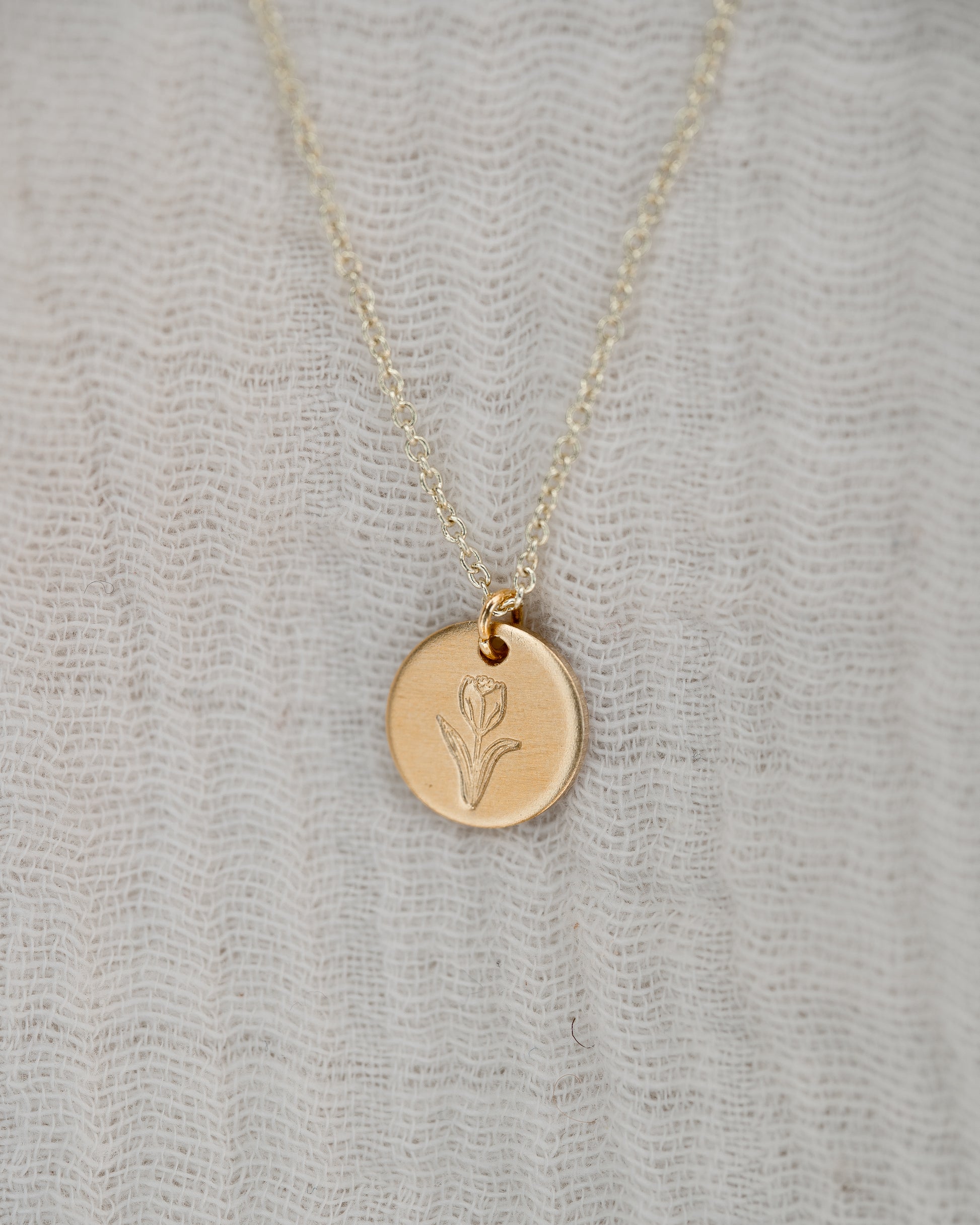 A hand-stamped brass pendant featuring a tulip, the perfect flower to give someone you love deeply.